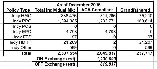 In any event, in December 2013 there were 590,000 people enrolled in grandfathered plans, which means the number dropped by 56% over the next 3 years. Assuming things continued at the same pace, as of December 2017 the grandfathered number should have been down to perhaps 200,000 as of December 2017.