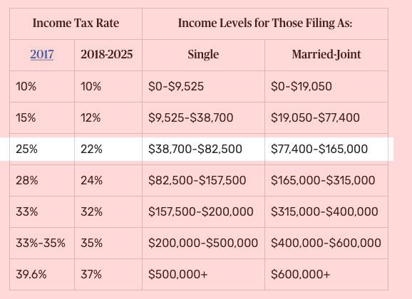 Here's a chart showing how federal income level tax brackets changed under the new GOP/Trump tax law. As you can see, just about all of them should fall smack in the middle of the third bracket, where their tax rate drops from 25% to 22%:
