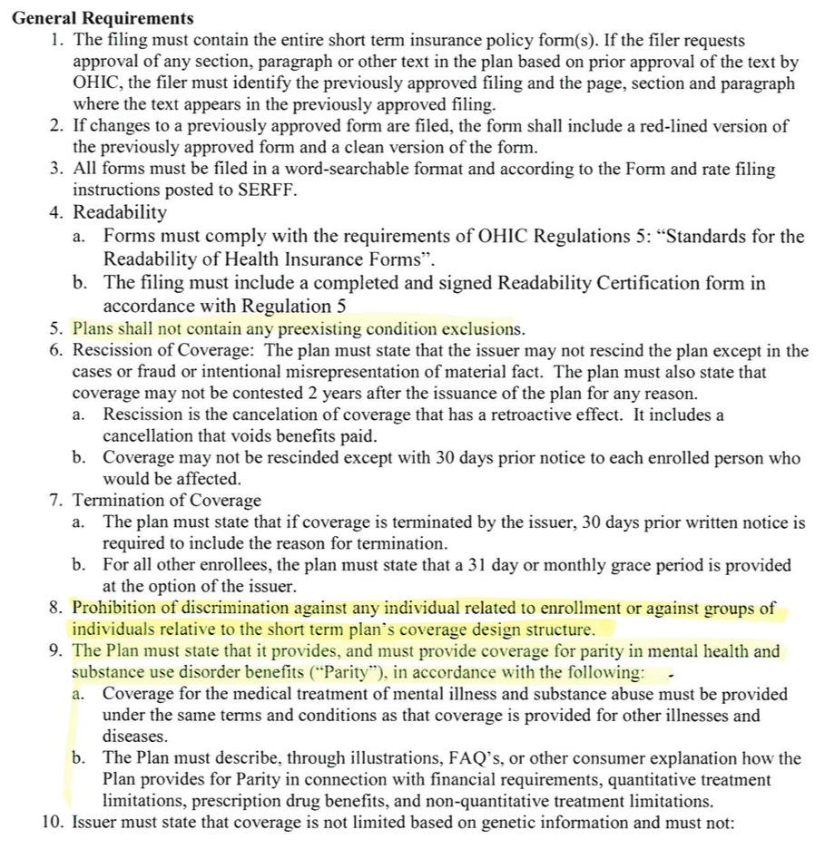 OK, so some of these requirements already apply, some...don't? In any event, the fact remains that STLD plans are allowed in Rhode Island but there doesn't appear to be much point in anyone buying them (which is fine with me). The main point is that neither BCBS nor Neighborhood seem to think they'll have more than a nominal impact next year even with Trump's executive order.