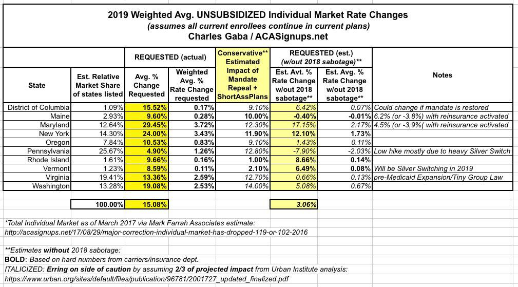 As of today, it looks like an average of around 15.1%, with around 12 points of that being due to mandate repeal / #ShortAssPlans, and the rest being actual, underlying cost increases and so forth. Obviously these numbers will jump around as more states release their data, and then they'll jump around again once the approved rate changes come in...not to mention other resubmission factors like Medicaid expansion in Maine and Virginia; reinsurance programs in Maine and Maryland, and so on.
