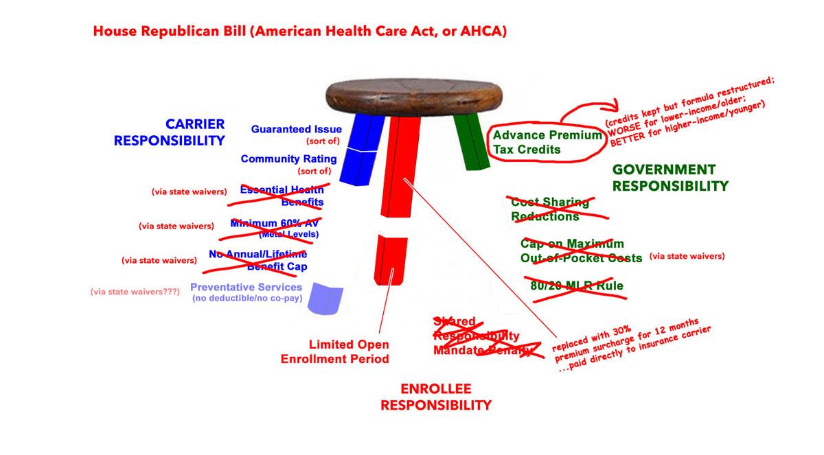 Now, you can argue about whether or not either of these "negative inducements" to get people to enroll would be more or less reasonable, or more or less effective, than the ACA's mandate penalty ($695/adult and $348/child or 2.5% of your household income), but the fact remains that both Mitch McConnell and Paul Ryan knew damned well that ripping away the Red Leg of the ACA without replacing it with some type of "stick" to counterbalance the "carrot" (financial subsidies/etc.) would be disastrous.