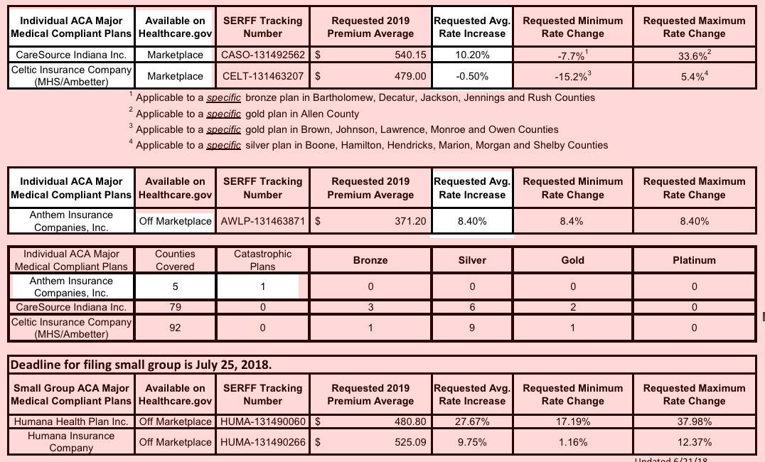 The Indiana Insurance Dept. has released the preliminary rate requests for 2019 insurance policies on the ACA individual and small group markets.