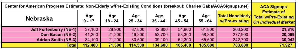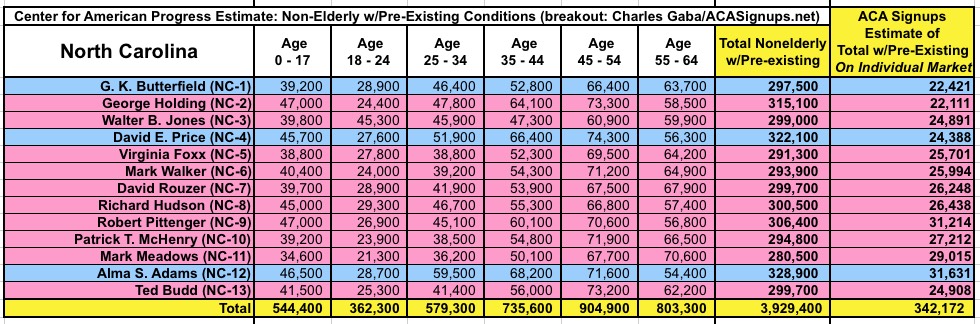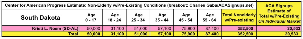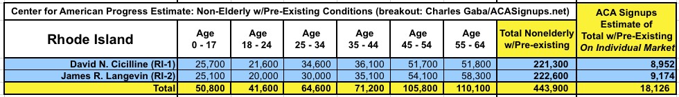 The CAP spreadsheet is extremely handy, and they deserve full credit for crunching the numbers. Unfortunately, it's only available as a single massive spreadsheet, so I've takent the liberty of grouping all 435 CDs together by state into shareable JPG images. I'm also color-coding each CD by party control and, while I'm at it, I'm also plugging in my own estimate of how many people currently on the individual market likely have some sort of pre-existing condition which would likely result in them being charged dramatically higher rates to the point that they likely couldn't afford coverage whatsoever if the Trumpcare 2.0 bill were passed. These estimates are obviously much lower than the total nonelderly population, and are based on: