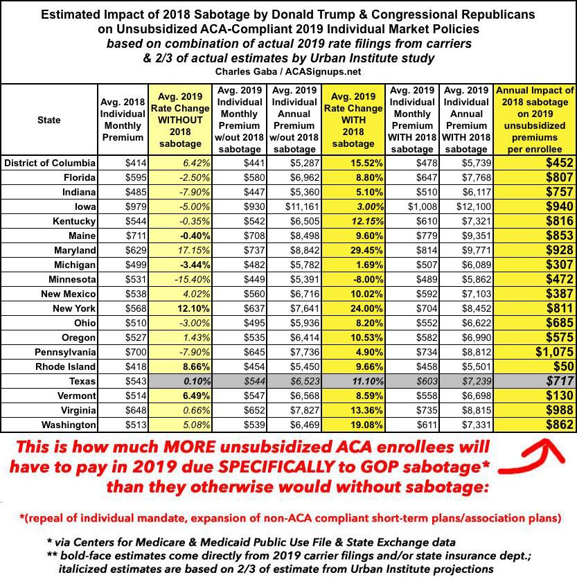 This will obviously change as more hard data is plugged in, but as far as I can tell, if it weren't for both 2017 and 2018 sabotage efforts by Trump and the GOP, 2019 rates would be averaging around $493/month per person. If it weren't for 2018 sabotage only, 2019 rates would likely be around $568/month. Instead, with both years worth of sabotage factored in, unsubsidized premiums will likely come in at around $630/month next year...fully $137/month more than they would if not for the 2-year onslaught. That's over $1,600 more per enrollee for the full year. If you only compare against 2018 sabotage, it'd be around $62/month more, or around $740/year...which is right in the midrange of the table below: