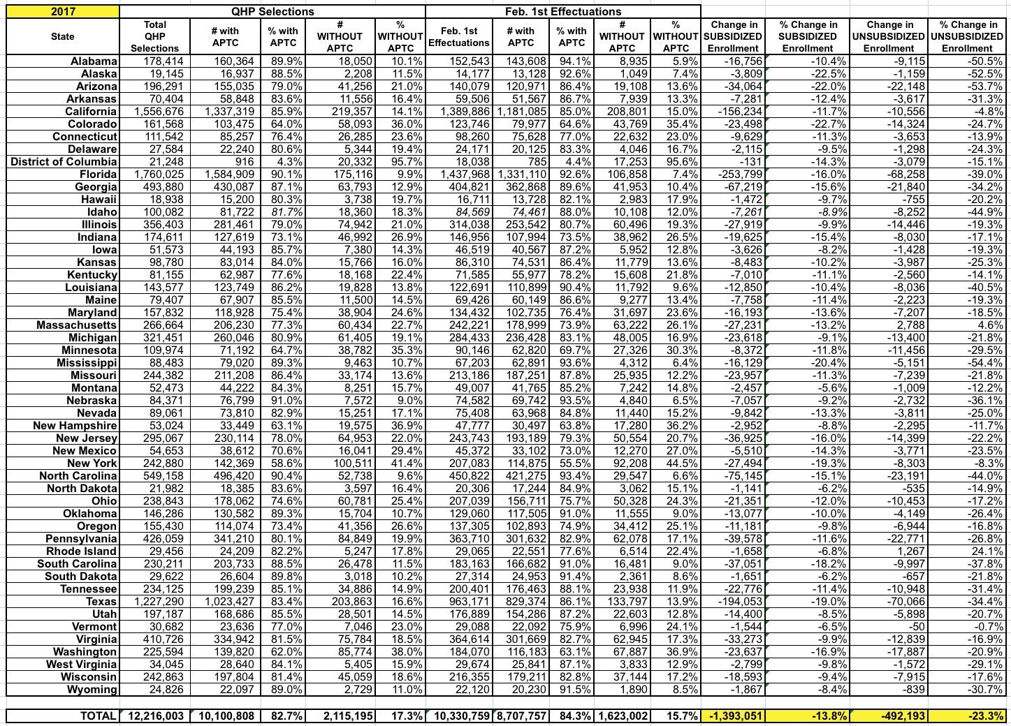 The next two tables look complicated but it really aren't. In the first table (subsidized enrollees), the first few columns come from the 2018 Public User File...these are the raw QHP selection numbers from the 2018 Open Enrollment Period through December 15 (or as late as January 31 in CA/DC/NY). The second batch of columns are the exact same data as of effectuated enrollees on February 1st...that is, again, after subtracting those who didn't pay and/or cancelled their policies before they even began.