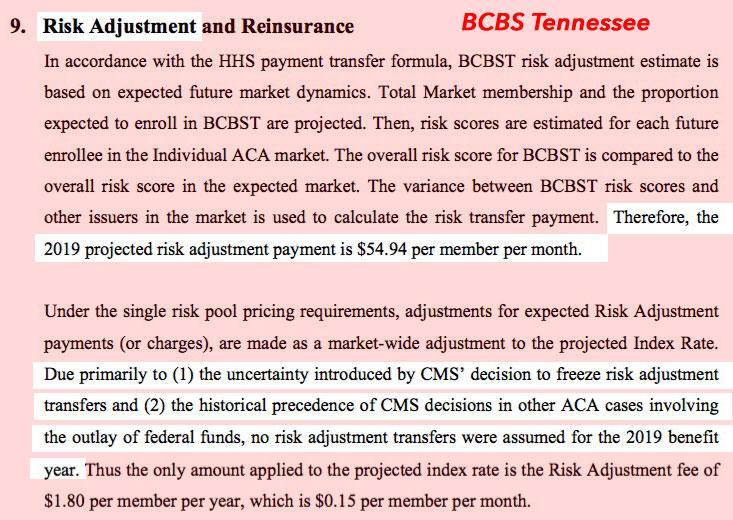 Yes, that's right: Blue Cross Blue Shield of Tennessee, which enrolls over 50% of TN's entire ACA-compliant individual market, was planning on dropping average premiums by a whopping 18% until Trump's CMS Dept. decided to freeze Risk Adjustment transfers for no legitimate reason whatsoever.