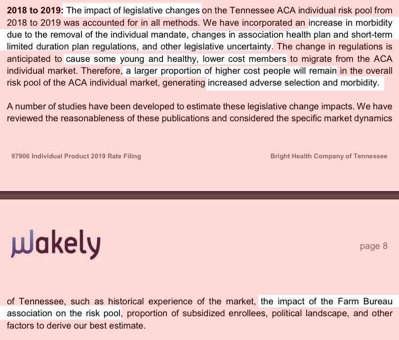 “The change in regulations is anticipated to cause some young and healthy, lower cost members to migrate from the ACA individual market. Therefore, a larger proportion of higher cost people will remain in the overall risk pool of the ACA individual market, generating increased adverse selection and morbidity,” new entrant Bright Health wrote in its TDCI filing.