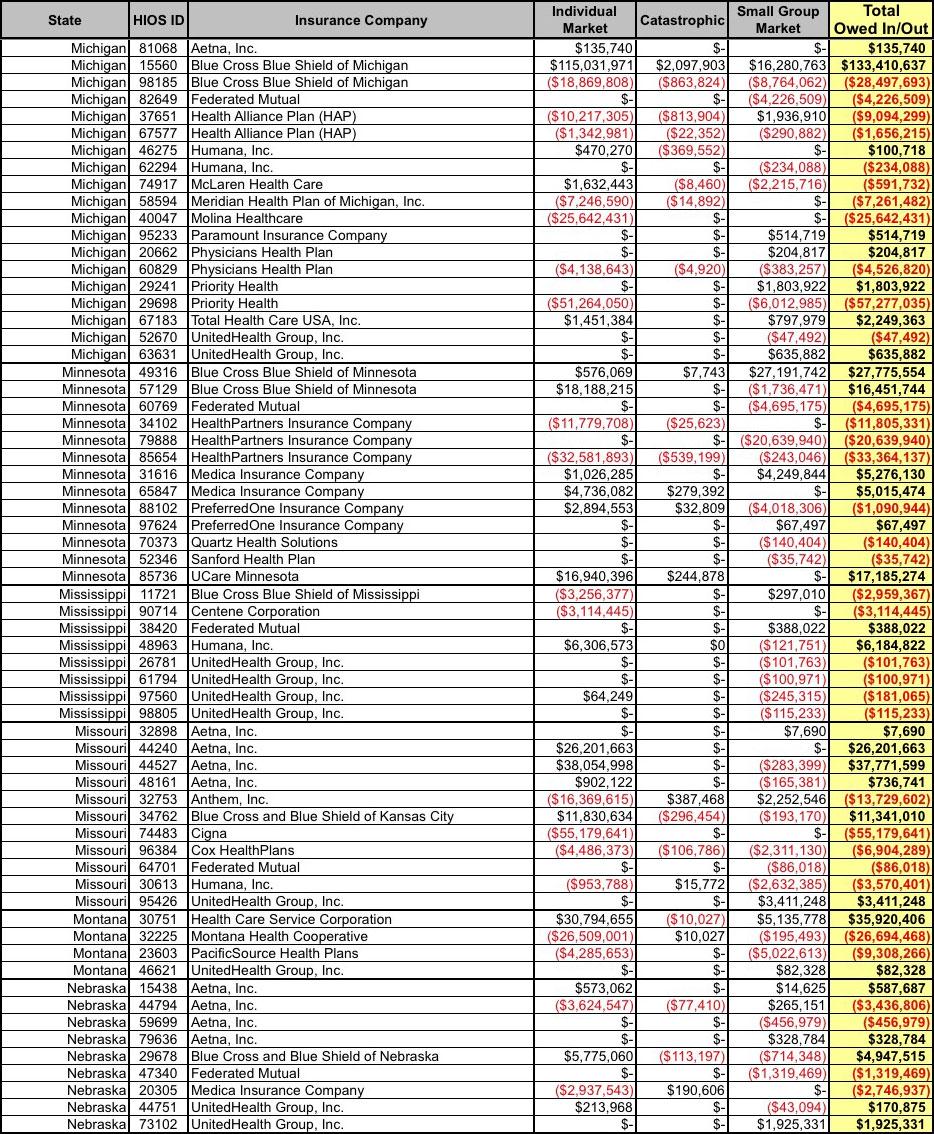 So, about an hour ago, CMS released the actual 2017 RA report itself, which lists (among other interesting info), exactly how much money insurance carriers in every state owe or are owed from last year. There are three categories: The Individual Market (Bronze, Silver, Gold & Platinum); the Catastrophic Individual Market; and the Small Group Market. the total amount of money involved is around $10.4 billion ($5.2 billion owed by carriers, $5.2 billion owd to carriers).