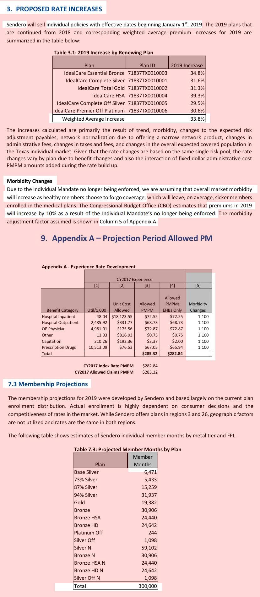 UPDATE: Thanks to Louise Norris for the heads up: Molina's Texas filing has been uploaded as well (see below), and is very specific: 236,000 current enrollees, a 13.3% average rate increase requested, and 9.9% of it is due specifically to the individual mandate being repealed. With Molina added to the mix, about 35% of Texas's total individual market is accounted for, with an 11.1% average increase with sabotage factors and a virtually FLAT average without it.
