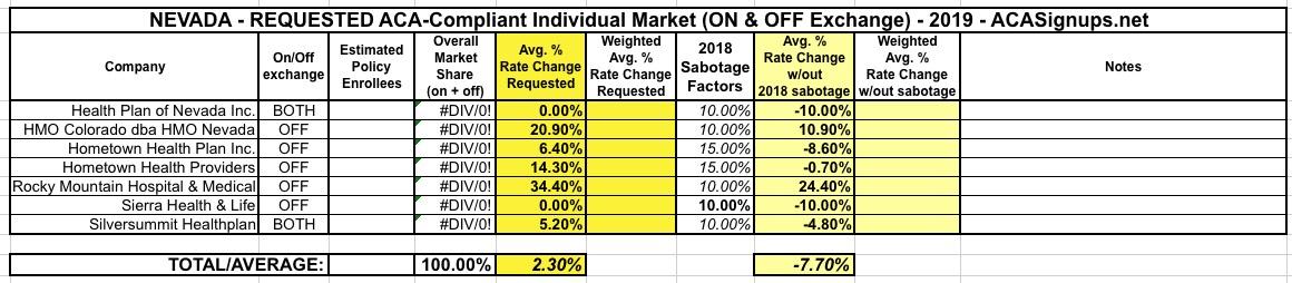 According to CMS, as of 2017, Nevada's ACA-compliant indy market was roughly 61% on exchange vs. 39% off-exchange. I'm assuming that trend has continued this year and is likely more like 65/35, which would mean a weighted overall average of roughly 2.3%.