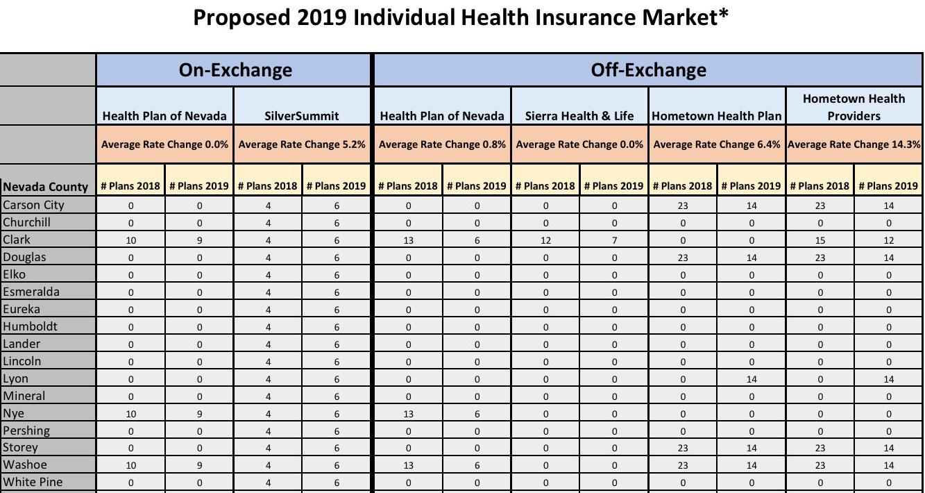 This year, Health Plan of Nevada proposed no rate increase and plans to offer nine plans for purchase on the exchange in 2019 in Clark, Nye and Washoe counties. SilverSummit, the insurer that stepped in last year to cover the 14 bare counties, plans to increase on-exchange rates by about 5.2 percent but will increase the number of plans it offers in all of the state’s 17 counties from four to six.