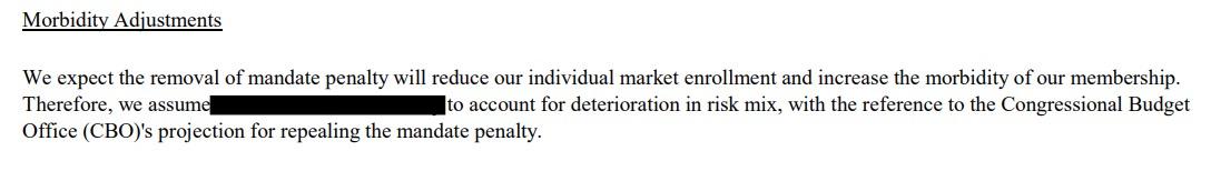 Unfortunately, most of the critical data points are redacted in the filing screen shots below, but at least one carrier (Sierra Health) comes right out and states that they're using the CBO's 10% hike estimate as guidance for the individual mandate repeal impact, while another carrier (Hometown Health) blots out their numbers but makes it very clear that they're assuming a higher impact from mandate repeal and #ShortAssPlan expansion than the CBO or other estimates suggest.