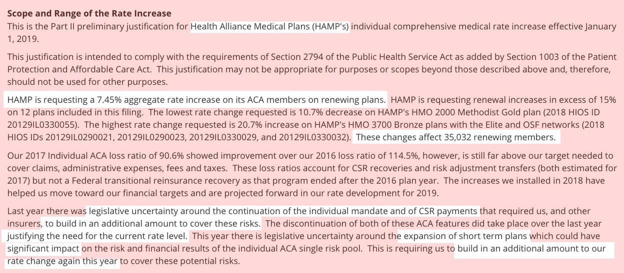 Illinois has the same four ACA indy market carriers participating next year as they do this year. All four rate filings specificlaly call out Mandate Repeal and #ShortAssPlans as significant factors in their rate requests, but none of them break out the actual amount, so I'm relying on my standard assumption of 2/3 of the Urban Institute's projections.