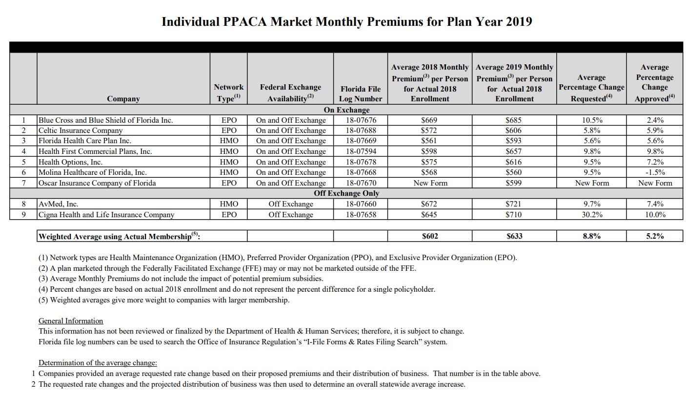 TALLAHASSEE, Fla. – The Florida Office of Insurance Regulation (OIR) announced today that premiums for Florida individual major medical plans in compliance with the federal Patient Protection & Affordable Care Act (PPACA) will increase an average of 5.2 percent beginning January 1, 2019. Per federal guidelines, a total of nine health insurance companies submitted rate filings for OIR’s review in June with final rate determinations due by August 22, 2018.