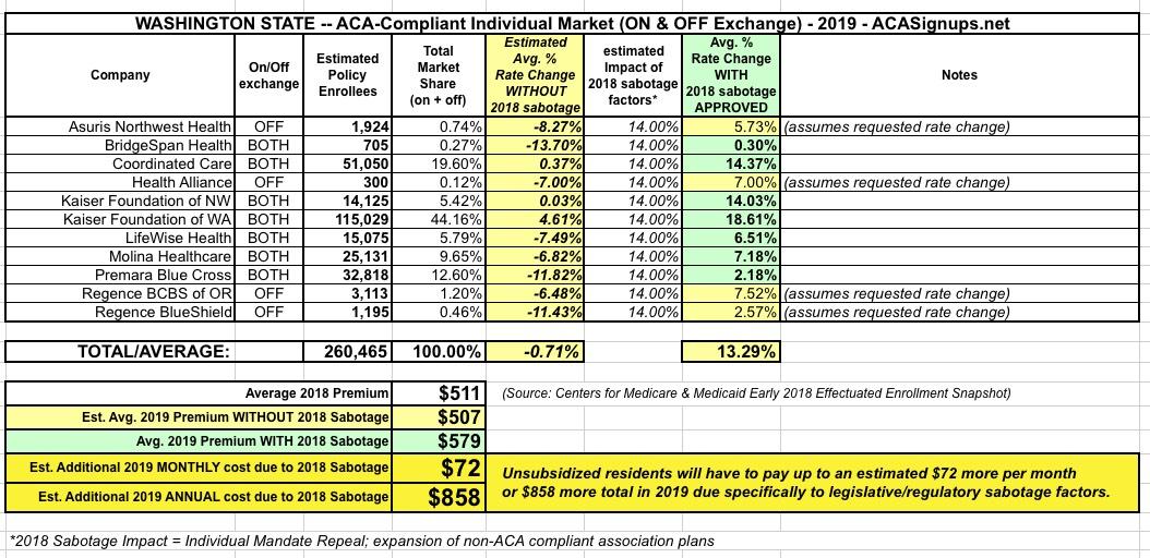 Washington State: APPROVED 2019 #ACA rate hikes: 13.8% (w/caveat) vs. likely FLAT w/out #ACASabotage