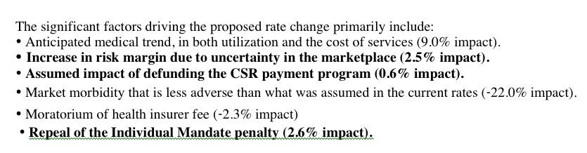 As you can see in the screen shots below, several of the carriers laid out exactly how much #ACASabotage is causing rates to increase next year (or at least how much it's cancelling out the price reductions). Interestingly, PreferredOne claims they don't foresee any impact...but again, they only have 300 enrollees to begin with, so that's not even a rounding error.