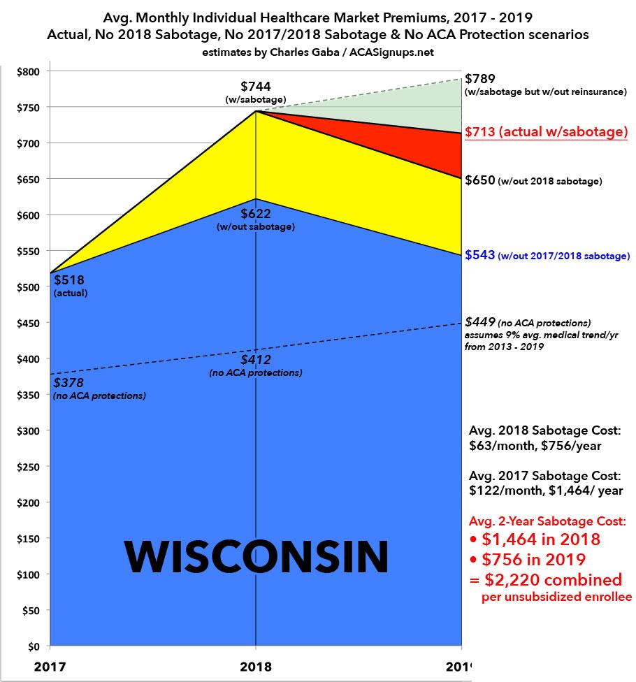 It's important to keep in mind that nearly half of this year's rate increase--roughly 20 percentage points--was due specifically to last year's sabotage efforts by the Trump Administration...primarily the decision to cut off CSR reimbursement payments, along with other sundry sabotage factors like slashing marketing by 90%, slashing navigators by 40% and so forth. As a result, unsubsidized enrollees in Wisconsin went from paying an average of $518/month in premiums to $744/month this year.