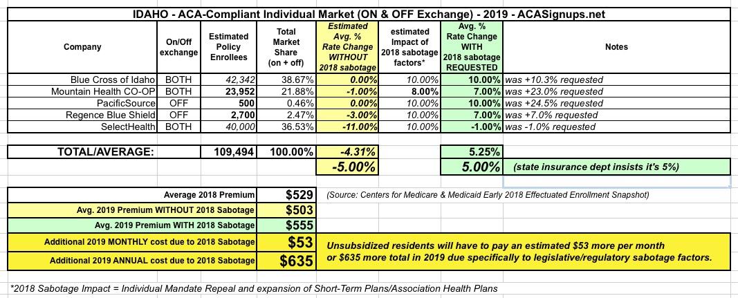 Unsubsidized enrollees pay around $529/month in Idaho at the moment, so that's around a $53/month difference, or around $635 more for 2019 per enrollee.