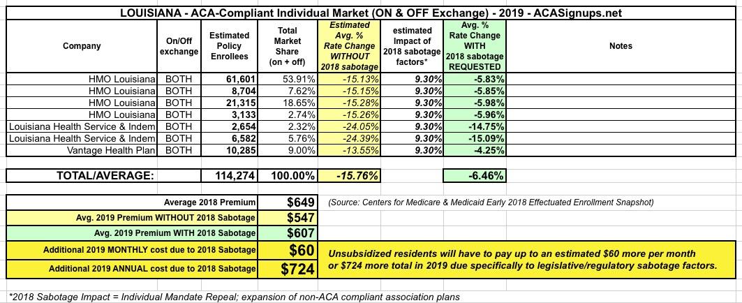 Louisiana: APPROVED 2019 #ACA rate changes: 6.5% *drop*, but WOULD have dropped by more like 15.8% w/out #ACASabotage