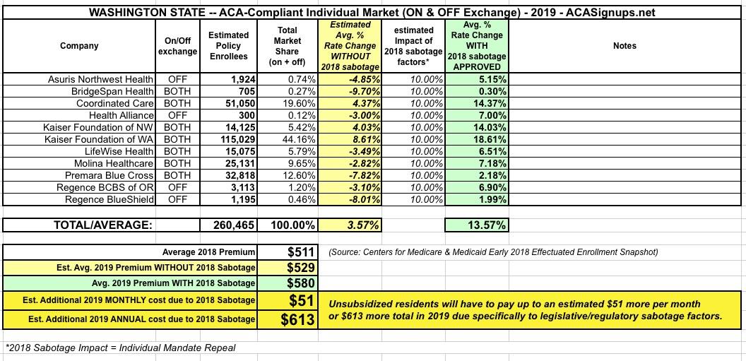 I should also note that while I had originally estimated the impact of 2018 sabotage by the Trump Administration at around 14% for Washington State due to the combination of the ACA mandate being repealed and the expansion of #ShortAssPlans, I've knocked my estimate of the impact on 2019 premiums down to a flat 10 percentage points thanks to Insurance Commissioner Kreidler's new rule regarding so-called "short-term, limited duration" plans: