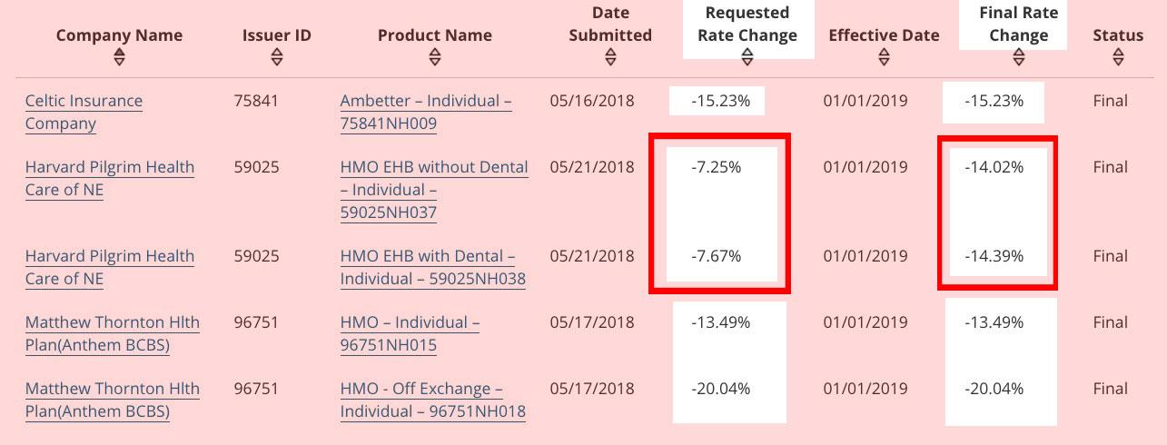 Things are slightly (and I do mean slightly) more noteworthy in New Hampshire. Again, there was no change to the requested rate changes for two of the three carriers offering individual market policies in the state, but Harvard Pilgrim did see their approved rates drop even further than the 7.4% they had requested, to -14.2%.