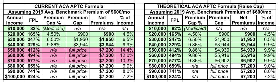 Once again: Under the ACA, if you earn between 100-400% FPL (between $12,140 and $48,560 for a single person), you're eligible for APTC assistance on a sliding scale. The formula is based on the premium for the Silver "benchmark" plan available in your area, which averages around $611/month in 2019.