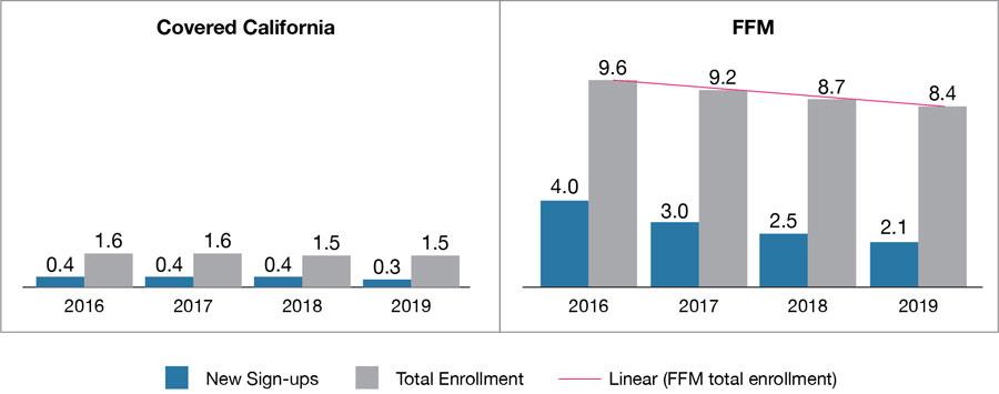 In addition, during the past three years that the current federal administration has made policy decisions to dramatically cut back on promoting enrollment, one result has been a substantial decrease in the number of new enrollees signing up for coverage: declining 49 percent from 4 million in 2016 to 2.1 million in 2019. (See Figure 1: Comparing Total Net Plan Selections in Covered California and the FFM.)