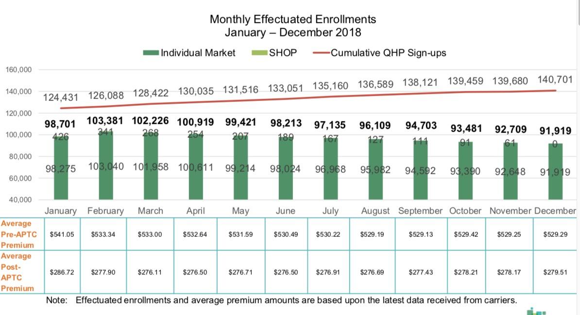 For instance, if you enrolled between 11/01/17 and 12/15/17, your coverage would start on 1/01/18. If you enrolled between 12/16/17 and 1/13/18, your coverage didn't start until 2/01/18. As a result, even though the official QHP total was 116,358 in Minnesota for the 2018 Open Enrollment Period, actual effectuation only peaked at 103,040 as of February (not including SHOP enrollees), or just 88.6% of that. Over the course of the year, there was net attrition each month, ending in 91,919 for December (79% of the official QHP total). The monthly average for the full year was 97,218 effectuated enrollees, or 83.6% of the QHP total. This is actually pretty typical nationally.