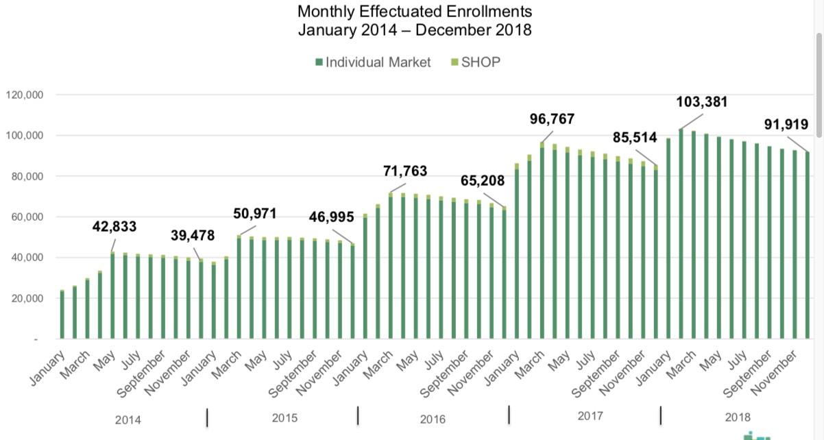 Here's the five-year monthly effectuation chart. It shows the same pattern I mentioned above: Effectuated enrollments always peak the month after Open Enrollment ends, then gradually drops off as the year passes before shooting back up again the following January. The December number is consistently around 90% of the peak month year to year: