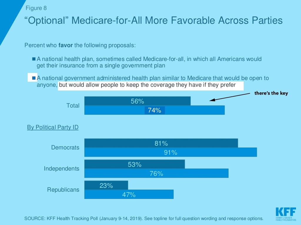 "Allow people to keep the coverage they have if they prefer" CLEARLY IS TALKING ABOUT MAJOR MEDICAL POLICIES, NOT SUPPLEMENTAL (although some might have concerns about their supplemental coverage, like MediGap, as well). And there's a whopping 18-point gap between those who say they support Bernie-MFA (which would be mandatory) and those who support making it optional for people to enroll or stick with private coverage (nearly all of which would be employer-based coverage, since around 11x as many people have employer coverage than individual market coverage in the first place).