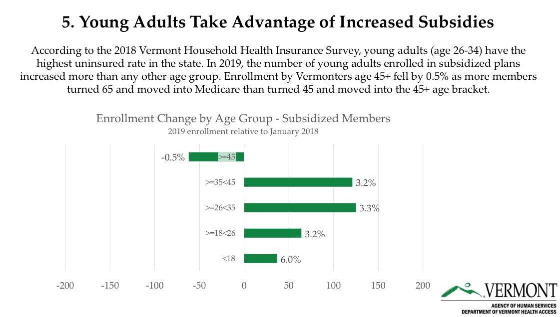 The number of subsidized enrollees under age 45 grew by three percent. Notably, enrollment grew most among young adults age 26-34 – the age group that the 2018 Vermont Household Health Insurance Survey found most likely to be uninsured. This increase in young adult enrollment more than made up for a slight decrease in enrollees over age 45, mainly attributed to baby boomers turning 65 and moving from commercial coverage to Medicare.