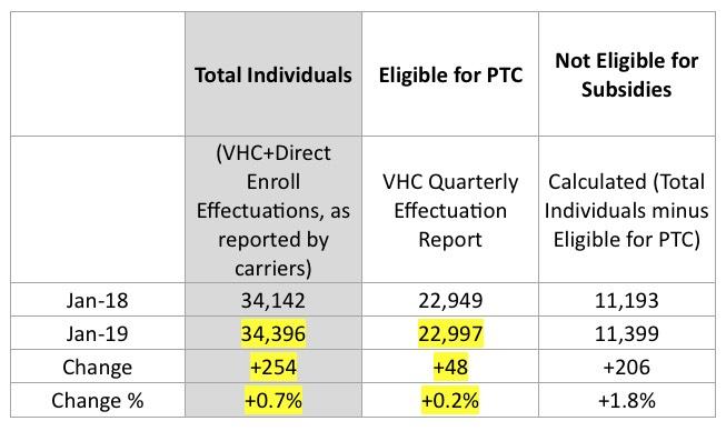 First, for the total individuals column, we found inconsistencies with one of our carrier’s direct enroll numbers and followed up with them last week. They looked into it and determined that their reporting had missed some folks, apparently related to changes with the codes attached to folks with this year’s reflective plans. They validated the corrected numbers, which brings the total who had effectuated January enrollment up to 34,396.