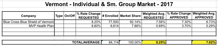 First, like four other states to date (Oregon, New York, Mississippi and Rhode Island), the Vermont state insurance dept. (called the "Green Mountain Care Board") has issued their 2017 rate change approvals: