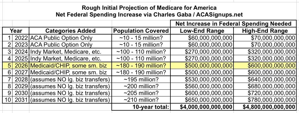 Using this as a rough baseline for 2026 specfically (and throwing on another $30 billion or so just for the hell of it), I've also gone ahead and retrofitted Years 3-4 and years 6-10 to give a very rough projection about what the 10-year CBO score might look like from 2022 - 2031. Note that I'm assuming that there isn't any significant transfer of employees working for large companies...the assumption here is that the only additional enrollment growth after Year 6 would come from normal population growth (newborn children, people turning 65, etc).