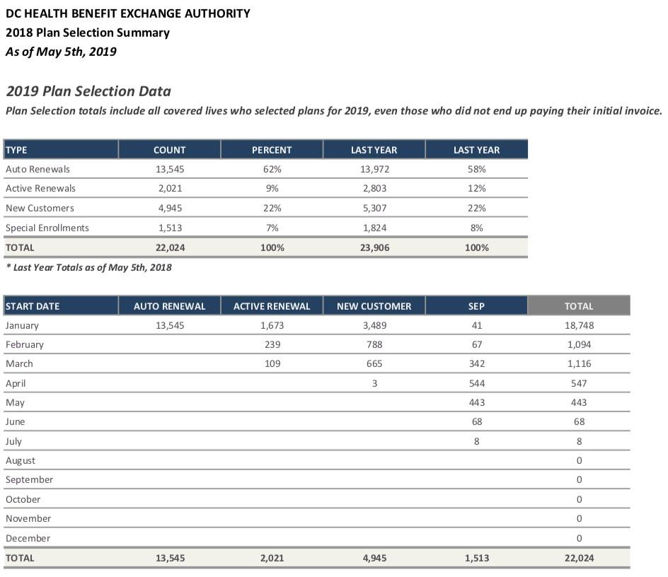 As you can see, after yesterday's deep dive into the potential 10-year cost of the Medicare for America proposal, I'm easing back today with some easy quick hits. The DC Health Link exchange has posted their Individual and Small Business enrollment report as of May 5, 2019.