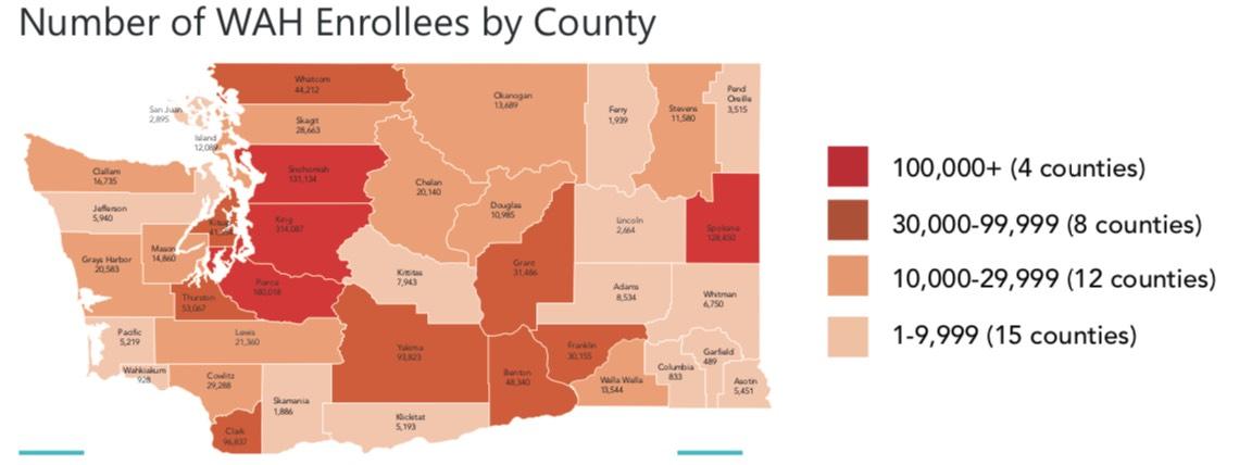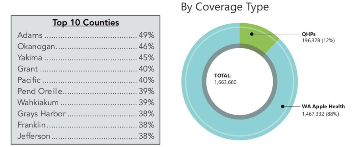 Nearly 200,000 customers used the state’s online marketplace to purchase a Qualified Health Plan (QHP) for coverage this year, adding to the more than 1.4 million residents who connected with free or low-cost health insurance through Washington Apple Health. In several rural counties (Adams, Grant, Okanogan, Pacific and Yakima), nearly half of the population relied on Washington Healthplanfinder to enroll in a 2019 health insurance plan.