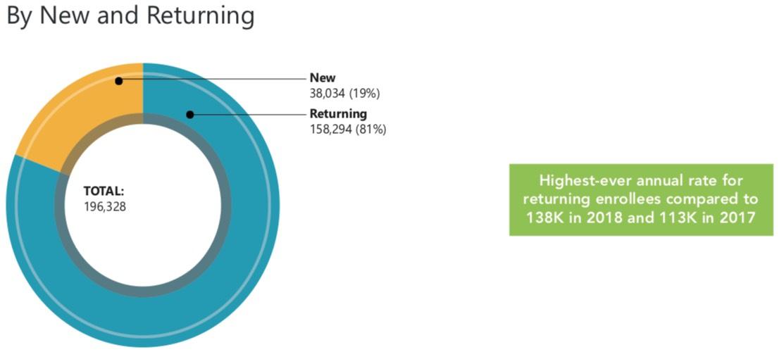 ...A key takeaway also included in the report is that a record high number of QHP enrollees are returning customers. Over 80% of total QHP customers in 2019 also purchased coverage through Washington Healthplanfinder in 2018.