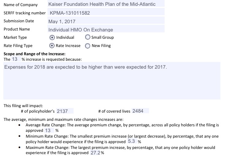 The filed rates show increases from 2017 for both individual and small group plans. In the individual market, CareFirst proposed an average increase of 39.6% for HMO plans, and 19.7% for PPO plans. Kaiser proposed an average increase of 13%.
