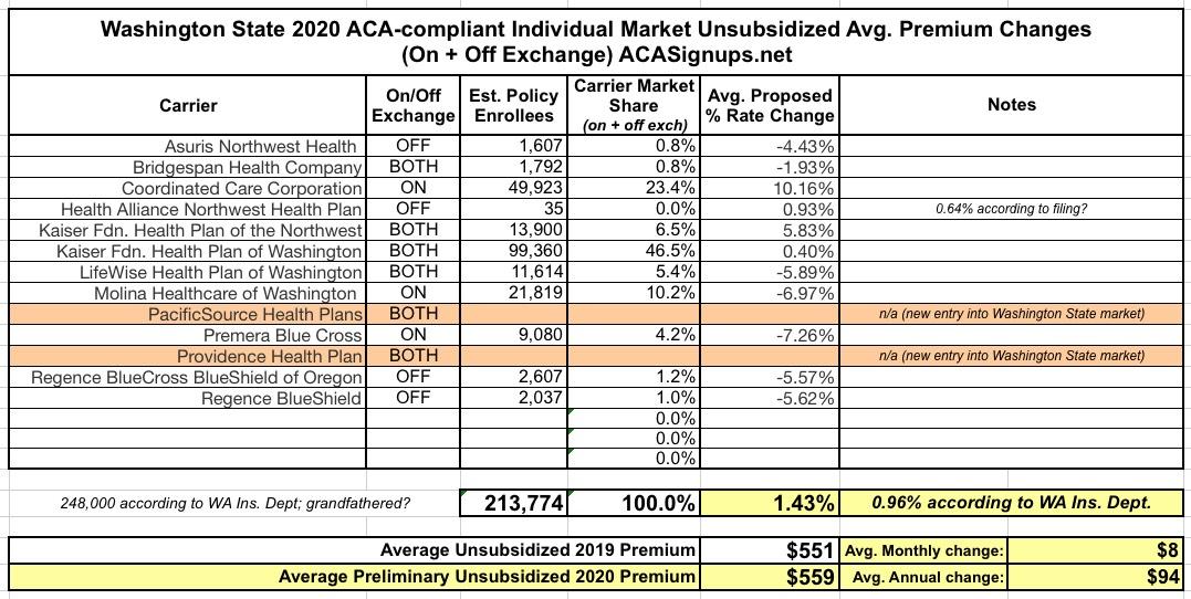 When I plug the hard numbers in from all of the insurers based on the rate filing summaries, I get a slightly higher weighted average of 1.43% instead of 0.96%, but that's pretty nominal and could be accounted for by several factors. Also, the grand total enrollment comes in at just 214,000 instead of the 248,000 noted in the press release; I'm not sure where the other 34,000 enrollees are...perhaps they're the last remnants of grandfathered plan enrollees? I did see one 2020 filing listing 6,300 enrollees in grandfathered LifeWise policies; it's possible that the other 28,000 or so are in grandfathered policies which aren't being renewed.