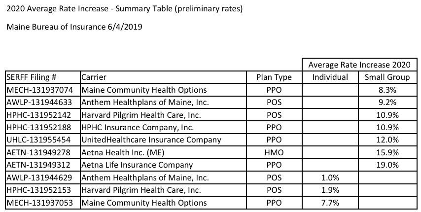 The state of Maine's Bureau of Professional & Financial Regulation has released their preliminary 2020 rate filings for the Individual and Small Group markets. Overall, the three carriers participating in their individual market are seeking a weighted average rate increase of 4.7% vs. last year. If approved as is, that would bring the average unsubsidized premium up from $675/month to $707/month, or around $381/year.