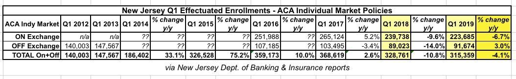 I took the liberty of plugging in the Individual Market effectuated enrollment numbers from all of the New Jersey charts into a simplified spreadsheet below: