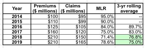 Their MLR was way too high the first two years...in fact, they lost money in 2014 and probably in 2015 as well, since administrative overhead/etc. costs more than 5%. things started to stabilize in 2016, and starting in 2017 they actually overshot the mark. In 2018 they seriously overpriced, so they instituted a price freeze in 2019.