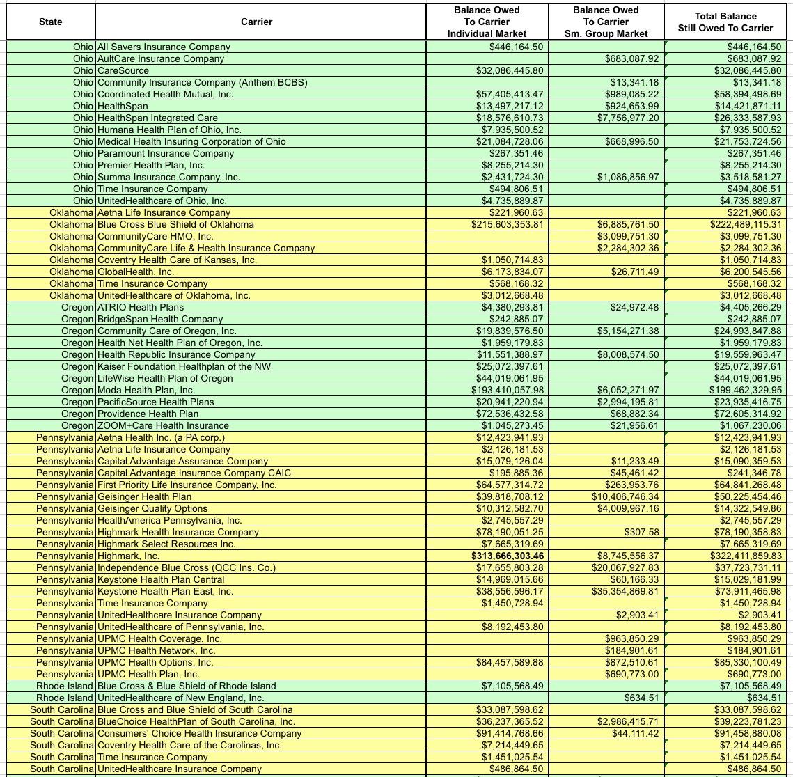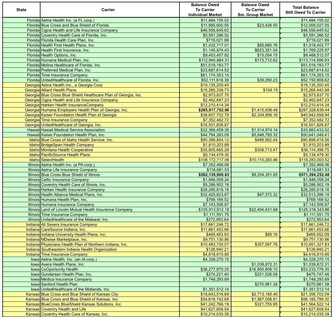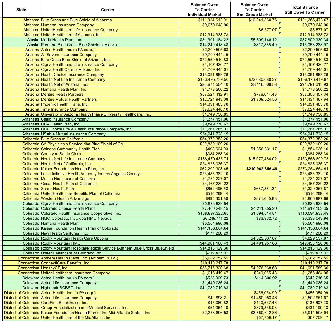 I noted earlier that a good twenty or so carriers have actually gone bankrupt...including Health Republic of NY. I assume their risk corridor payment would go to pay back the creditors. A few others have merged with or been acquired by other carriers; I have no idea how that will be handled.