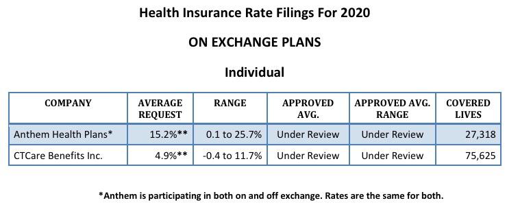 The Connecticut Insurance Department has posted the initial proposed health insurance rate filings for the 2020 individual and small group markets. There are 14 filings made by 10 health insurers for plans that currently cover about 242,000 people.