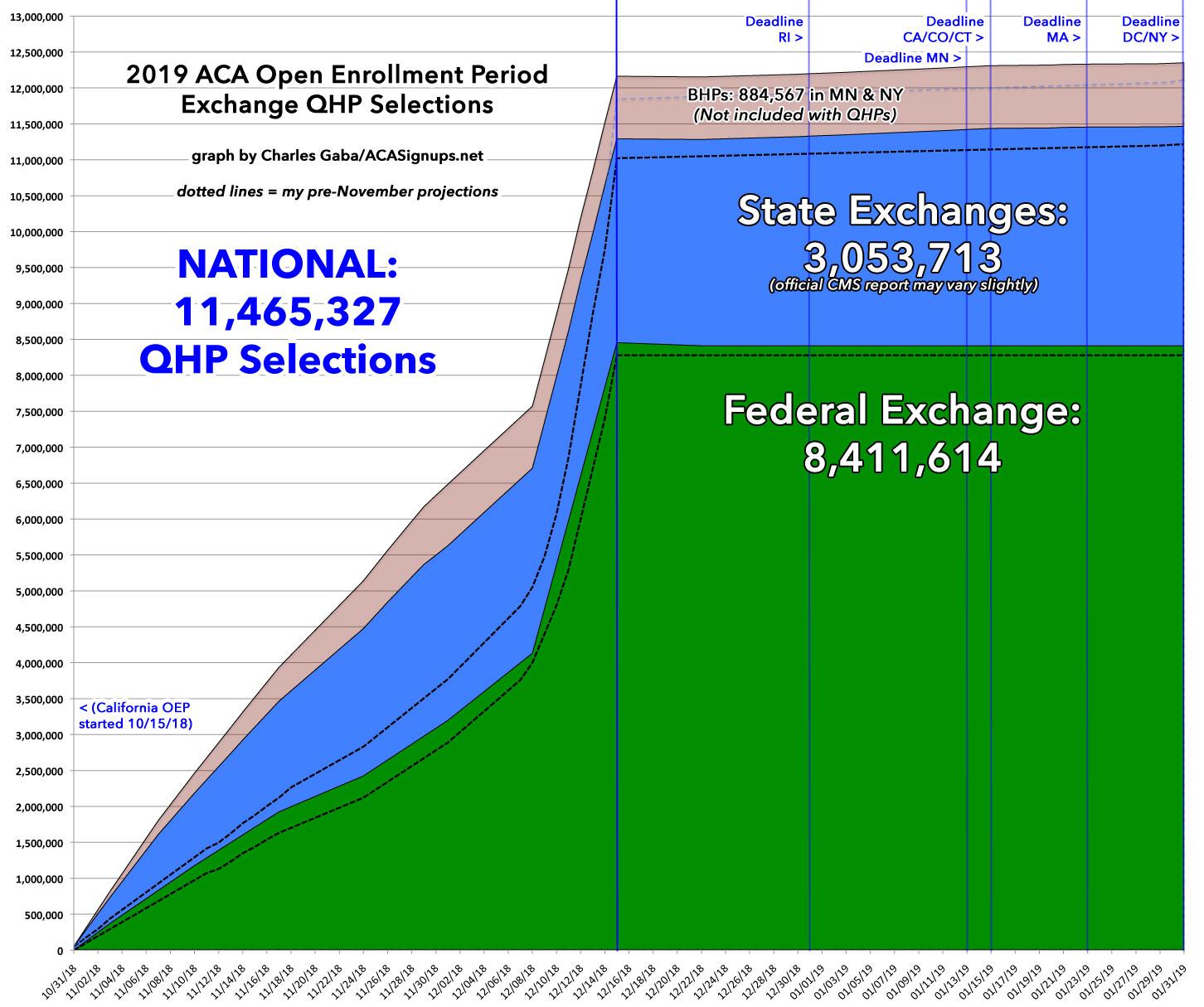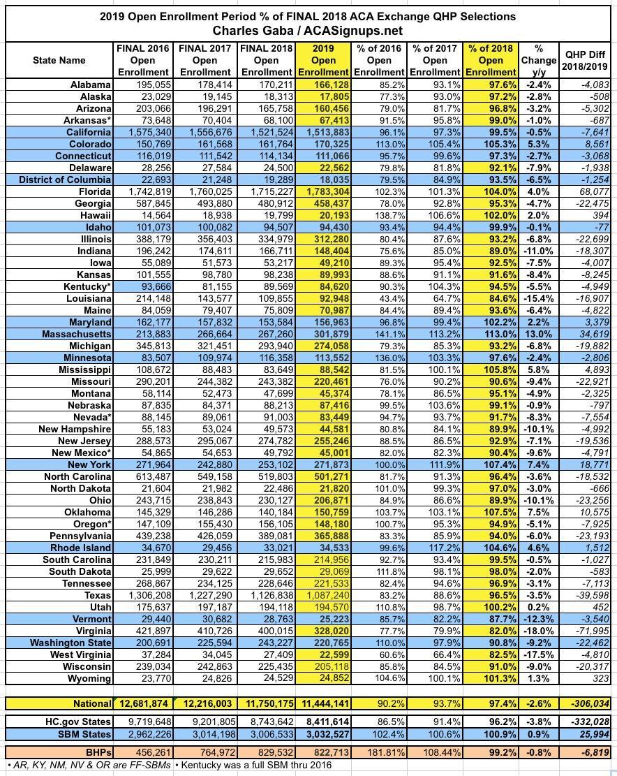Two weeks ago, I posted a semi-final state-by-state 2019 Open Enrollment Period breakout which had the total at 11,430,438 QHP selections nationally.