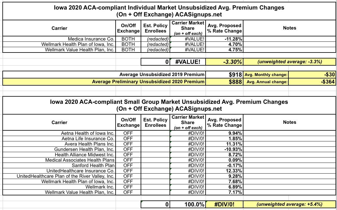 (sigh) As is common this year, the rate filings for Iowa's Individual and Small Group market are heavily redacted, making it impossible to calculate a weighted average premium rate change. On the Indy market, Medica is reducing their unsubsidized 2020 premiums by 11.3%, while Wellmark is raising theirs by around 4.8%.