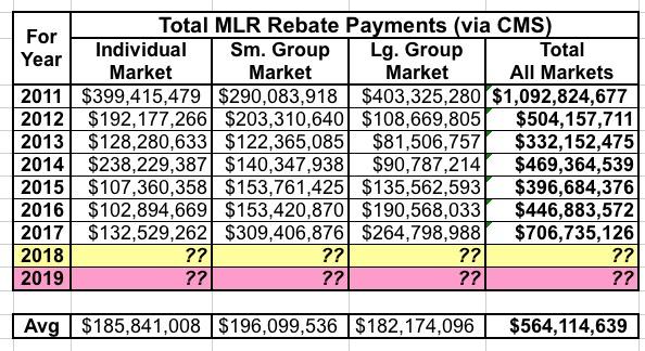 To give you an idea about how much money we're talking about, here's how much was paid out in MLR rebates to Individual market enrollees over the years: