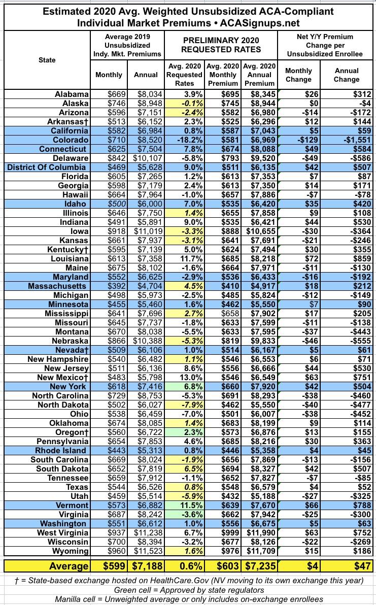 - The states with manilla cells usually have unweighted (or semi-weighted) averages, which means I had to simply add up the requested changes for every carrier and divide by the total. This means some of the averages could be greatly skewed (for instance, if BCBS has 90% of the market and a 10% hike, while another carrier has 10% and a 5% reduction the unweighted average would be +2.5% but the weighted average would be +8.5%)