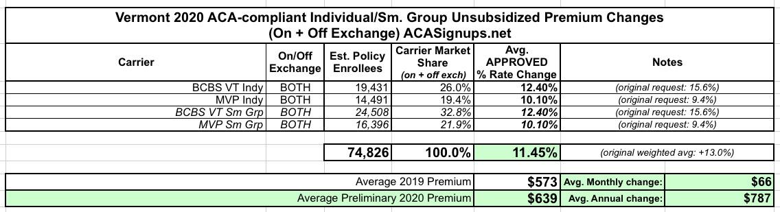 Vermont: APPROVED avg. 2020 #ACA premiums: +11.5% (down from +13%)