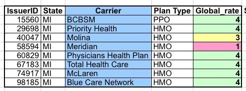 I downloaded the PUF for 2019 and took a look at the Michigan carriers listed. It's extremely cryptic and wonky, and I had to do some research to look up the actual carrier names since they aren't included in the CSV file itself, but as far as I can tell, here's what it looks like here in my home state: